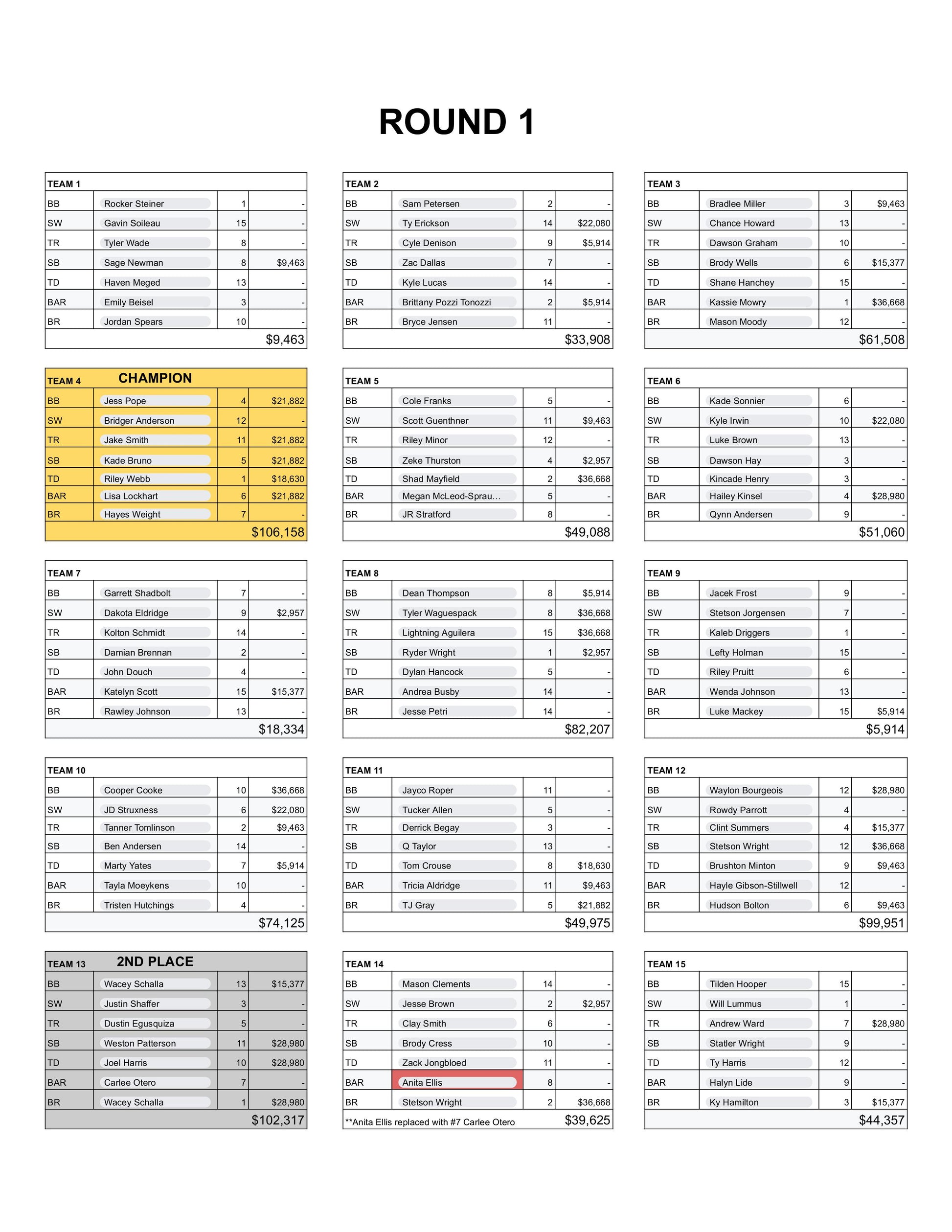 - 15 teams randomly arranged with one contestant from each of the 7 NFR events.