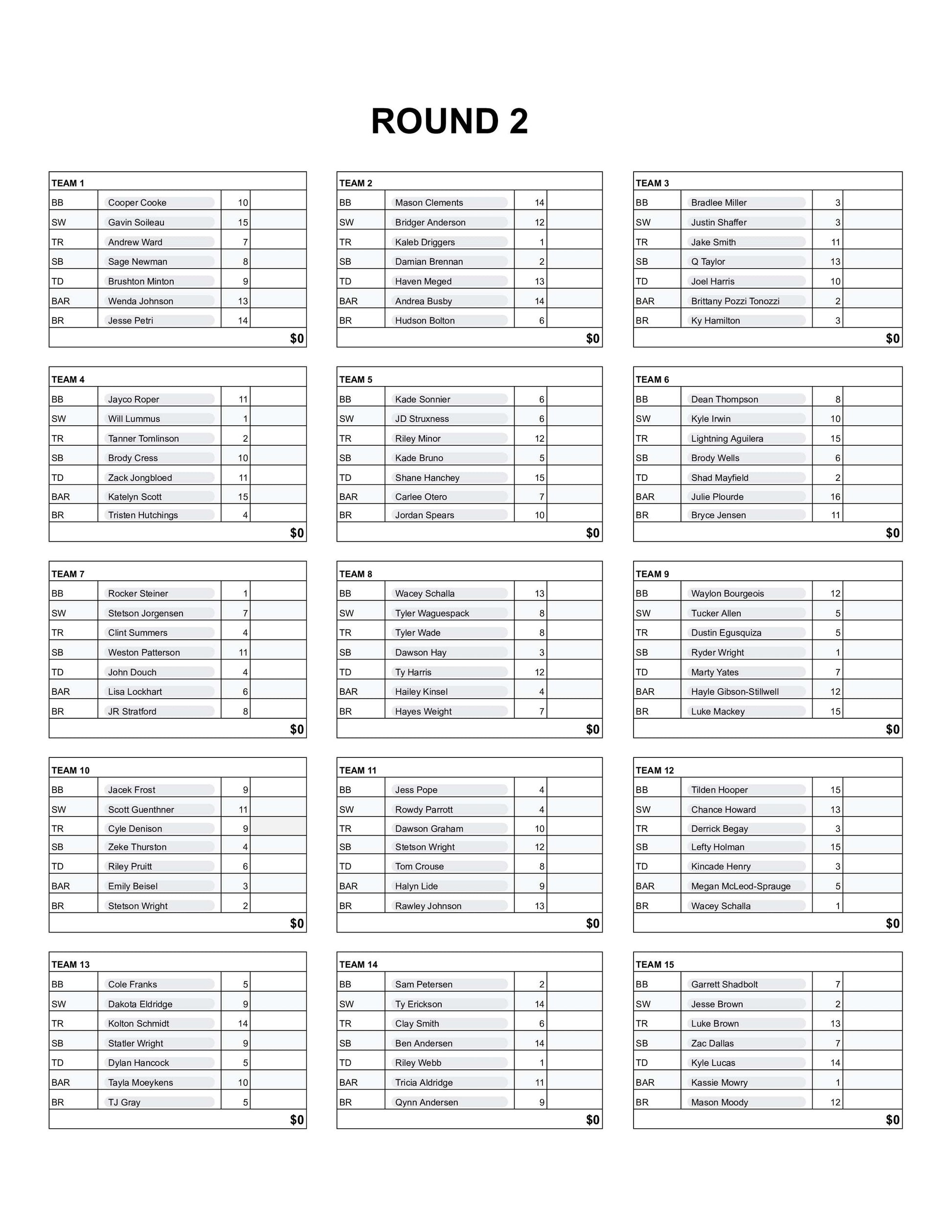 15 teams randomly arranged with one contestant from each of the 7 NFR events.