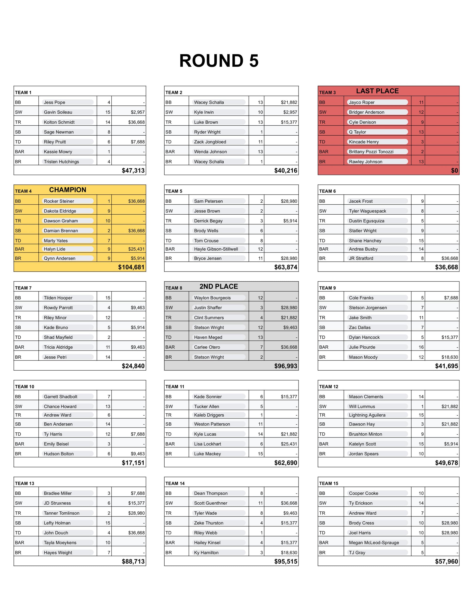 15 teams randomly arranged with one contestant from each of the 7 NFR events.