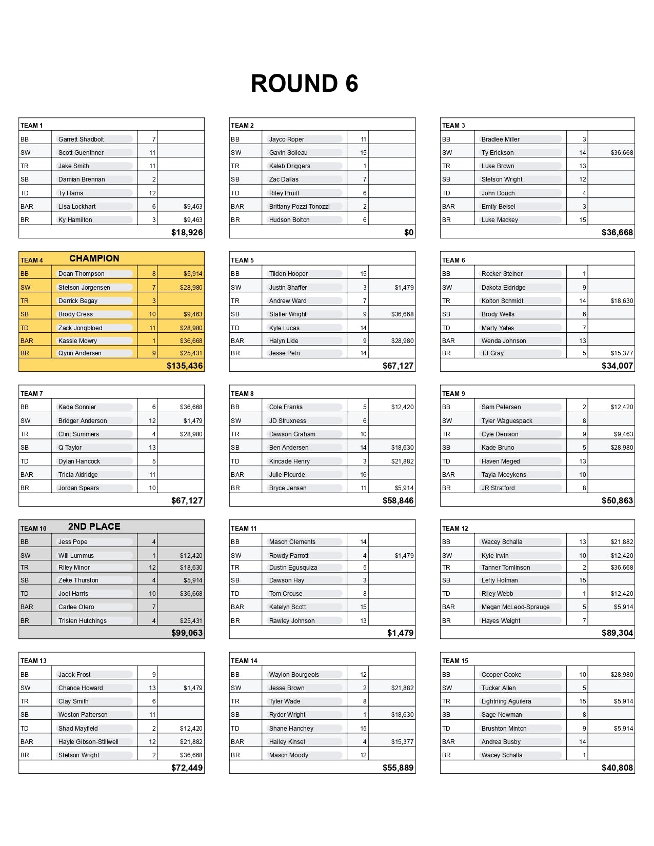15 teams randomly arranged with one contestant from each of the 7 NFR events.